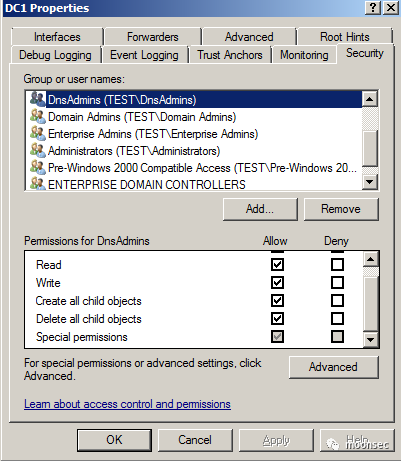 DNS 服务器作为域控制器上的服务运行。可以通过运行 dnsmgmt.msc 并连接到 AD DNS 服务器(通常是域控制器)来访问管理界面。它允许用户配置 DNS 区域、查找、缓存、转发和日志记录等。这个“层次结构”中的几个对象是安全的——DNS 服务器对象(不是计算机帐户)、区域对象和记录。在本例中,我们对服务器对象感兴趣,其 ACL 在全新安装时应如下所示: