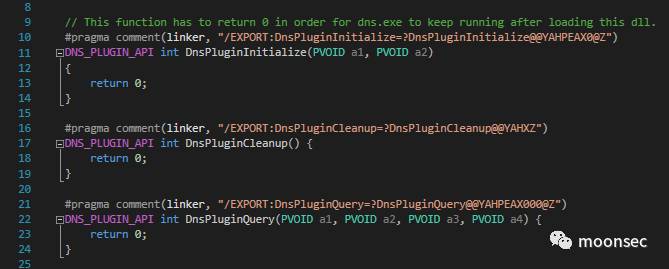 我们遇到的障碍确实是唯一的 - 如果 DLL 无法加载,或者它不包含 DnsPluginInitialize、DnsPluginCleanup 或 DnsPluginQuery 导出之一,则服务将无法启动。我们还需要确保我们的导出全部返回0(成功返回值),否则也可能导致服务失败。