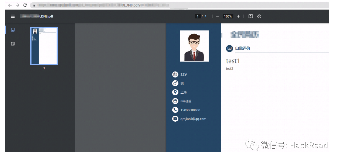 然后我们发现,网站有一个功能可以把简历转成pdf并下载,而在线编辑的是html格式,而且这一转换过程是在后端完成,并且导出的pdf中标签依然是被解析的,如下图所示,导出的pdf中上方的字体也明显变大,说明h1标签被解析
