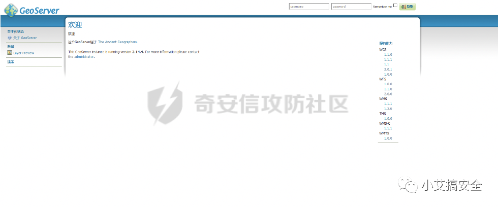 8085端口geoserver,进入登陆页面,使用默认账号密码admin/geoserver成功登录后台。