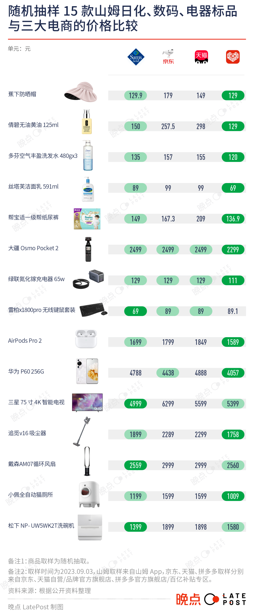 2015 年,一场新零售大战在中国打响。一方是全国开了数百、上千门店的传统商超永辉、大润发、家乐福,另一方是有互联网资本与技术撑腰的盒马、京东七鲜、每日优鲜。盒马和背后的阿里集团那时信心十足,料想互联网驱动的新零售必将重塑行业生态,成为中国中产阶层日常消费的去处。如今,8 年过去,和 7000 万中国中产人群关系最密切的零售品牌不是那场战役的任何一个参与者,而是在当时被所有人忽视掉的山姆会员店。据《晚点 LatePost》了解,截至 2022 年底,山姆会员店在中国大陆地区经营 42 家门店,营收约 660 亿元——超过了 370 家门店的盒马鲜生。500 万山姆会员最少每年付 260 元会费,去年平均为山姆贡献 1800 元净利润。小米要卖 15 部手机才能产生一张山姆会员卡的利润。(注:沃尔玛中国对上述数字表示不予置评。)并不是那些大公司轻敌。山姆在中国市场的前二十年堪称寂静无声。它 1996 年跟着沃尔玛卖场来到深圳,此后 20 年,只在个位数城市开设门店,多数经营状况不佳,一度濒临倒闭。外界只有在论证沃尔玛在中国水土不服时,才会提及山姆。当零售的哲学、路线和模式之争在中国市场最为热烈时,没有一家公司把山姆视作参考对象。直到三年疫情期间,山姆脱颖而出。看中生鲜零售市场的互联网企业普遍在学山姆。盒马最近的 「移山价」 系列促销活动在社交媒体上广为热议。《晚点 LatePost》了解到,这不仅仅是一次短期促销。盒马希望借此倒逼产品团队和供应商一同改革,提升效率,通过规模效应压低成本。早在 2020 年,盒马高层就将山姆作为自己最重要的竞争对手,在当年 7 月成立 「X 会员店」,复刻山姆模式。从那时候起,盒马开始在多方面向山姆学习,包括生产更多自有品牌商品,还复刻了山姆爆款:瑞士卷、烤鸡、榴莲千层蛋糕等。过去几年,互联网平台公司京东、美团、阿里天猫,传统零售商永辉、麦德龙、大润发都曾专门研讨过山姆会员店。据不完全统计,目前有 12 家公司开设了类似山姆的会员店或仓储店,包括大润发、京东、麦德龙、永辉。随着中国的互联网公司不再只追逐最广泛的受众、最高的销售额,他们普遍 「降本增效」,期望从依然保有相当消费力的中国中产群体赚取利润。零售业的比拼从流量回归产品和细节,大公司们遇到一个棘手的对手。在互联网行业把 「流量」 挂在嘴边之前,超市已经把零售做成了流量生意,并一步步推向极致。2002 年开始,品牌要让一款商品登上家乐福中国的货架,首先需要支付一笔进场费;为了拿到更好的位置,品牌还需要支付堆垛费、宣传费、节庆费、店庆费等等一系列销售费用。一位从业十几年的商超采购这样描述自己的工作:高速公路收费员。这些收费员们甚至更有权力,他们掌握着几百种商品的生死存亡。收多少的费用,谁能上架,谁被下架,如何陈列,直接影响一款商品的生命周期和销售业绩。当超市售卖的主要是消费者的注意力,它们自然不再追求一款商品是否适合消费者,而是谁愿意付出最高的费用。一家典型的大卖场塞进 20000 - 30000 个 SKU,鼓励品牌竞价。品牌在超市花了更多费用打广告,最终这些成本都加进商品价格,由消费者买单。淘宝、京东摧毁了商超的盈利法宝。电商的货架无限大,可以卷入更多品牌竞争。他们也有更灵活的广告展示空间,流量生意比传统商超更极致,更迅速。2015 年后,沃尔玛、家乐福、永辉等陆续陷入关店潮。山姆、Costco 这样的会员制仓储超市是极少数免于电商冲击的零售业态。他们尝试了另一种可能性——直接向消费者收会员费(每年最低 260 元),让消费者不用费心挑选。两家公司各提供 4000 款商品。20000 平方米的巨型超市提供的商品选择和一间 7-11 便利店相当,只有传统商超的 1/5。冷藏存储的鲜奶,盒马货架上摆着近 30 款选择、京东七鲜超过 40 款。山姆只有三款。山姆期待消费者不花时间挑商品,而是信任超市提供了最合适的选择。 ![]()