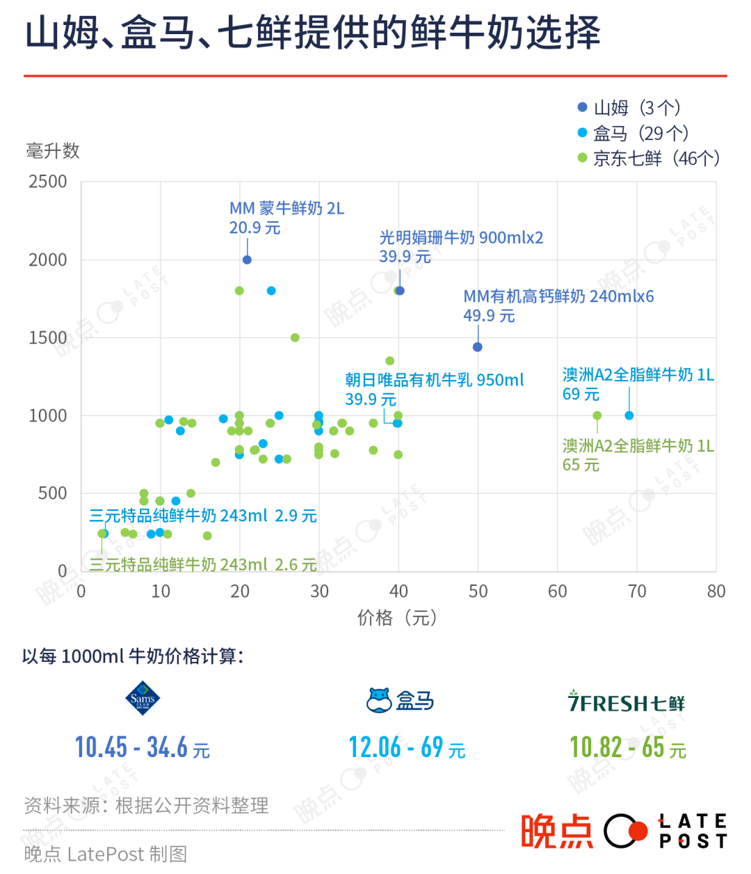 一些定价更高的烘焙品牌会选植物奶油,而山姆瑞士卷选择了动物奶油,并确保烘焙预拌粉中不添加香精等。一家新零售品牌的烘焙研发负责人在研究山姆产品后得出的结论是,不是做最好的,也不做最差的,而是在一个价格区间内,品质最优,最具性价比的商品。性价比一部分来自分量,大包装、高单价、低均价。山姆的大部分商品都更适合 3 人以上的家庭。保质期 3 天的瑞士卷一盒就是 16 片、同样 3 天保质期的麻薯一盒 24 个。直接送到家的冰鲜牛排,最小一份也得 800g,两个人一般需要连吃两顿。200 元以上的澳大利亚进口冰鲜牛排、一整块的三文鱼腹肉、整条的黑猪肋排和各类热食、烘焙产品。到门店购物消费者,平均每次花掉上千元。虽然总价高,但顾客们无法拒绝极高的性价比。山姆的冰鲜牛肉、三文鱼和一些竞争对手的同等级冷冻产品同等价格。大包规的生鲜、食品折合成均价也很有竞争优势。山姆 4000 个 SKU 的商品按照类别可大致分为:鲜食类 40% - 45% ,干货类 30% 左右,非食品类 30% 左右。山姆内部将这些商品分为四大类:潜力品,上市后复购率和渗透率优秀的新品,将获得更多资源支持;结构品,各个品类下必须有的产品,如美国 Prime 标准牛肉、挪威冰鲜三文鱼;选品上,山姆奉行 「宽 SPU 、窄 SKU」 原则,即品类丰富,但每一类只提供个位数(通常为 1 - 3 种)商品选择。商超和新零售渠道最多能提供几十种不同的选择。山姆在品类上有所取舍,以确保规模。要性价比,更重要的是不做什么。山姆在肉类中主推牛肉,而非猪肉等中国人主要食用的肉类。这基于两个判断:一是山姆拥有竞争对手少有的全球供应链优势。沃尔玛全球供应链和八百多家山姆会员店的供应链和冷链物流基础,让山姆可以采购整牛进行分切,产品价格和物流成本具有显著优势。另一方面则是,山姆判断中国人消费的猪肉数量已经逐渐到顶,未来会摄入更多其他肉类,所以山姆不再对猪肉品类进一步开发,而选择与国内猪肉企业合作。一些品类则被山姆放弃。盒马等新零售渠道提供最活泼生猛的海鲜,但山姆仅上架速冻或冰鲜的海鲜。山姆曾解释说,活海鲜在运输和暂养过程中极易出现死亡病变、二次污染,很难保证营养价值和风味。不做活海鲜也是为了性价比。鱼虾从捕捞到门店,保证鲜活需要投入巨大物流成本,货损居高不下,售价必然被抬高。一只 2 - 3 公斤帝王蟹收购价通常在 30 - 50 美元(218-363 元人民币)之间,经历几次航空运输,流通到国内市场后售价上升几倍。在盒马鲜生门店,一只鲜活帝王蟹售价通常要上千元。山姆将帝王蟹捕捞后漂烫煮熟冷冻,船运发往中国,一只卖 300 - 500 元。同样的,因为缺乏价格优势,过去几年在各类新零售渠道崭露头角、备受中产喜爱的品牌,如朝日唯品牛奶、黄天鹅鸡蛋、獭祭冰激凌、Chobani 希腊酸奶等,都不会出现在山姆货架上。山姆只有三种鲜奶选择:20.9 元 2L 装的 MM 鲜奶,39.9 元 900ml x 2 的娟姗牛奶,49.9 元 240ml x 6 的 MM 有机高钙牛奶,供应商分别为蒙牛、光明和圣牧有机。每一个选择都比约 40 多元一升的朝日唯品便宜得多。三款商品均是供应商为山姆专门定制,同时满足中国和欧盟双标准(欧盟标准蛋白质含量高于国标,同时生乳菌落数量和体细胞指数更低)。对于鸡蛋,山姆只有 0.8 元 / 枚和 0.9 元 / 枚的普通鸡蛋和最贵不超过 1.9 元 / 枚的谷物鸡蛋,只提供 30 个和 60 个包装的版本,而不是新零售品牌 2 个、6 个、10 个、15 个、30 个每份多种包装规格。山姆大多数生鲜商品的分量都不适合独居人群和两人家庭,因此长期被诟病。但山姆很少妥协。一位行业人士认为,山姆清楚地认识到只有放弃一部分市场才可以实现规模化和性价比。同时,这也是筛选客户的手段——大家庭的生鲜复购量显然会更多。一位前山姆采购告诉《晚点 LatePost》,一个好商品,但价格过高,消费者往往只是偶尔尝鲜,不会持续复购,就无法带来规模效应。山姆一般不会选择这样的商品。在仓储会员店,大多数商品的采购都不只是签一个订购协议。如果山姆采购团队判断一个商品值得开发 / 引进,他们会尝试找到行业第一名的企业谈判,试图用规模效应拿到最低价格。如果拿不到满意的价格,则放弃第一名,寻找第二名、第三名或周边行业的成熟企业,由山姆重新制定标准,合作制造平价替代品。开发商品时,消费场景和生命周期被山姆更前置地考虑。山姆会选择不做短保的、季节性的产品,商品的生命周期最好在一年以上,能被更多人购买和消费。在早期调研中,麻薯、瑞士卷等产品在消费者认知中既是零食点心,也是早餐选择。基于此,它们得到了更大的支持,后来都成为爆款,为山姆留住老用户、吸引新用户。当消费者对山姆这个渠道逐渐产生信任,它开始做更复杂的商品,剥离品牌造成的溢价。最典型的例子是红酒、威士忌,两个售价由品牌决定的品类。山姆通过在产区收购酒庄或签下大额采购协议,直接产出专供商品。在同一产区内,一些酒庄品牌红酒经过 「代理商——多级分销商」 网络,抵达电商渠道时,售价为 200 - 300 元。电商平台上 18 年份威士忌价格普遍在 1000 元以上,山姆则可以控制在 100 - 200 元,威士忌价格在 500 元左右。山姆一年 600 亿多元的销售额,论规模只有阿里集团的 1/125、京东的 1/50,但它只有 4000 款商品。具体到中产消费里的一些品类和款式,山姆已