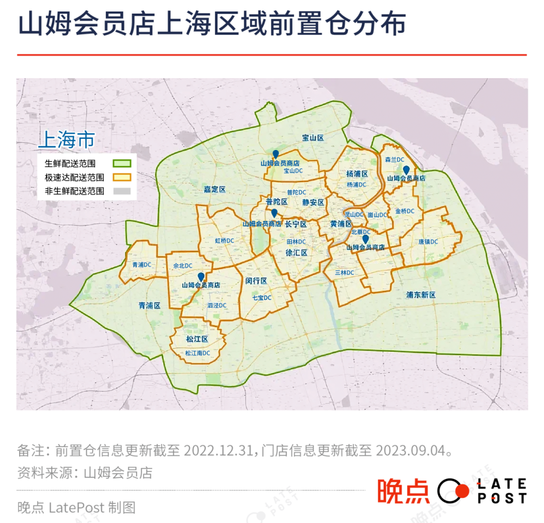 今天,全球销售额前 10 名的山姆会员店,近一半在深圳、上海、北京等地。深圳福田店 2008 年成为全球单店销售额冠军,此后连续 15 年位列第一,去年收入超过 30 亿元,相当于 27 家永辉超市。如果只是提供高性价比商品,需要顾客进店推车购物,山姆抓不住如此大的红利。中国的竞争对手帮助它完成了新消费的转型。2016 年沃尔玛战略入股京东,并在此后联合投资京东到家。双方签署战略合作协议,山姆在京东开设官方旗舰店,部分商品进入京东自营仓库,在全国多数地区实现次日达配送。当每日优鲜、叮咚买菜在全国铺设前置仓,山姆也开始设立前置仓,由京东的达达独家配送。在多个城市的主要城区,山姆已可以实现 1 小时配送到家。达达每天配送的 200 万个订单中,有接近 40 万个来自山姆。2022 年,山姆的电商配送订单增速超过 300%,日均订单超过一半来自前置仓。同期,盒马 X 并未开设前置仓,仅提供门店 5 公里即时配送和 20 公里的次日达。Costco 最近才刚刚测试次日达配送,不提供即时配送。对于绝大多数地区的中国中产消费者,哪怕是在竞争对手密布的上海,山姆都是最方便的仓储会员店。 ![]()