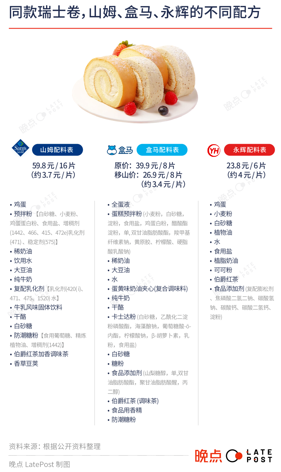 这才是山姆逻辑的真相:不仅是 「精选商品」,而且提供 「超值体验」。最能代表山姆的商品可能是瑞士卷,一款奶油夹心蛋糕,配料干净、用了欧洲进口的动物奶油。但它最大的优势在于价格——一大盒 16 片,分为原味和伯爵红茶口味,算下来一片不到 4 元。星巴克一片瑞士卷售价抵得上山姆 8 片,多数品牌烘焙店瑞士卷定价也要超过 10 元一片。2019 年推出后,山姆瑞士卷凭借绝对优势的性价比很快成为爆品,销售额就占部分门店月营业额的 8% - 10%,年销售额曾达到 10 亿元以上。今天,平均 1000 名山姆顾客会带走 300 盒瑞士卷。永辉、盒马鲜生都曾在山姆瑞士卷成功之后上架同款,定价都高于山姆,未能复刻其火爆。一位永辉人士告诉《晚点 LatePost》, 如果要用山姆瑞士卷相同的原料且保证足够利润,起码要将售价至少调高 30%。 ![]()