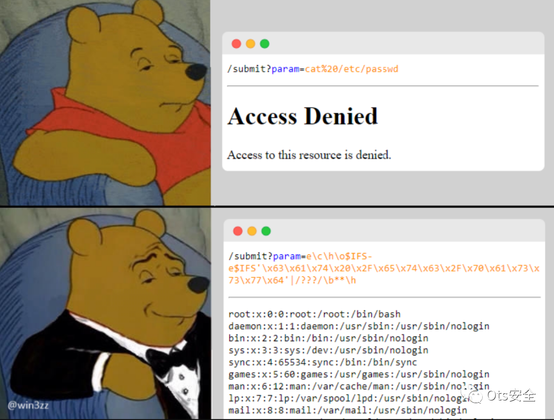 有时,您可能会在目标网站上获得操作系统命令注入,但由于“echo”、“/etc/”、“cat”、“passwd”等受限关键字,有效负载可能会被 Web 应用程序防火墙 (WAF) 阻止。这是一种成功传