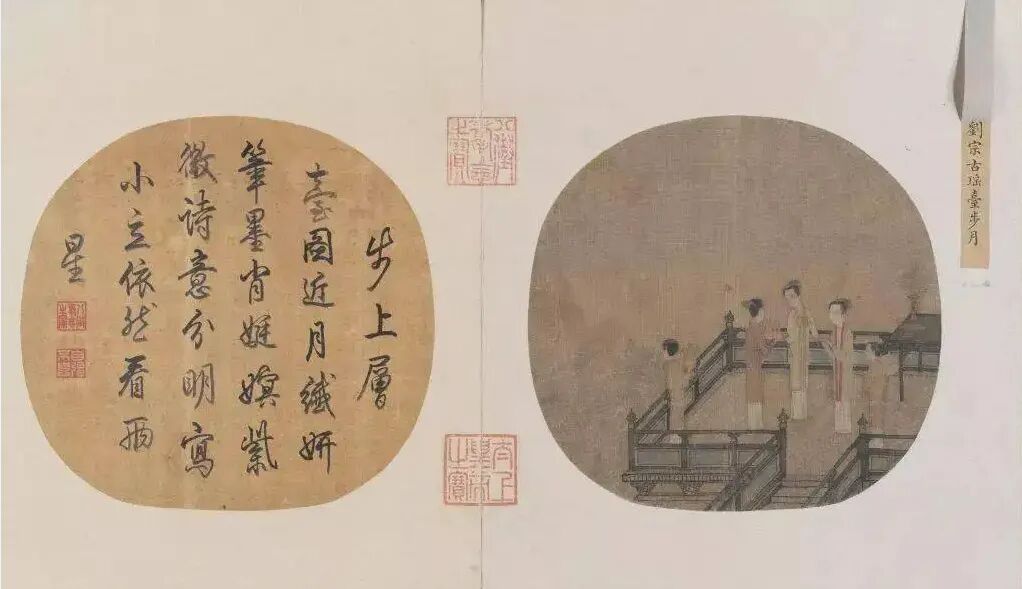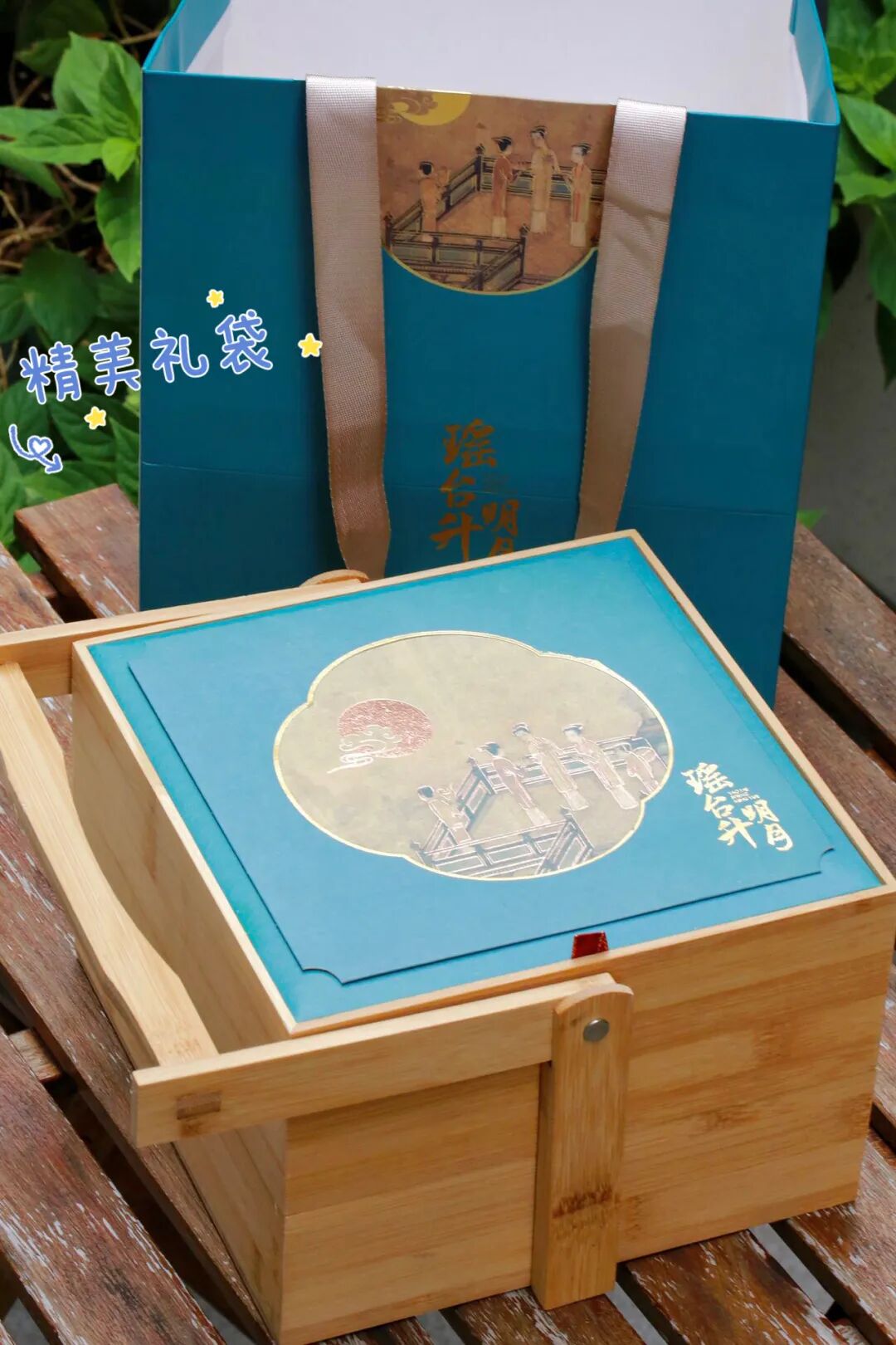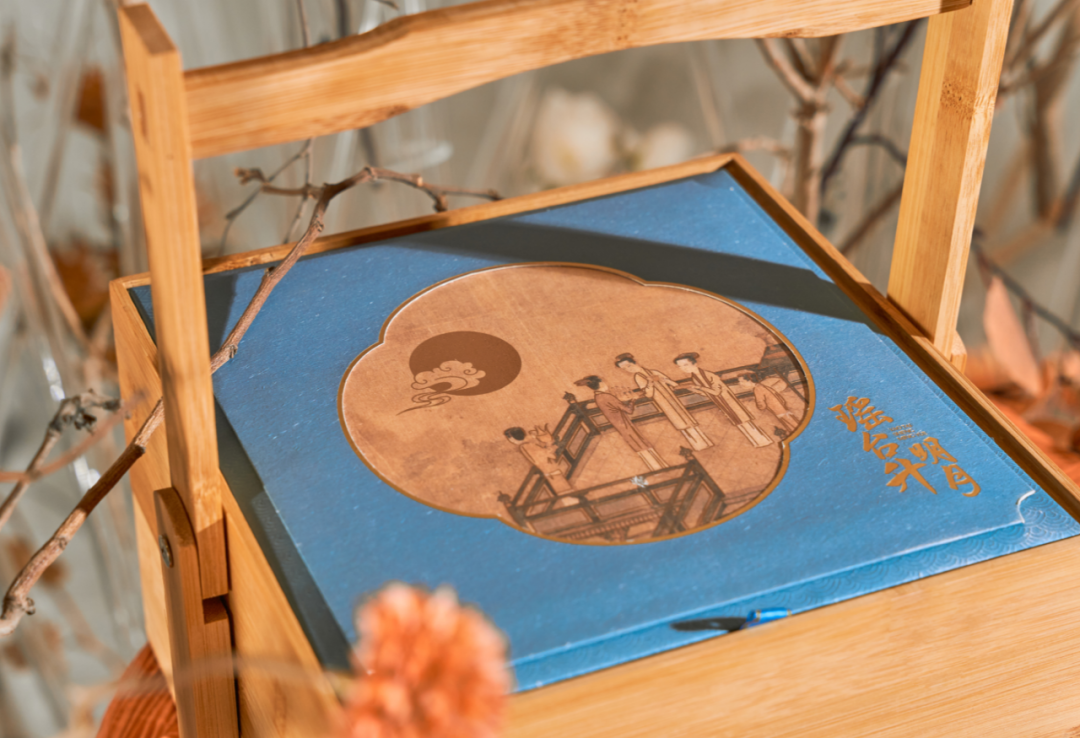 这款提篮礼盒的盖板画面选用宋代古画《瑶台步月图》,几位佳人登上瑶台,赏月吃饼,充满诗意,完美诠释中式古典浪漫。