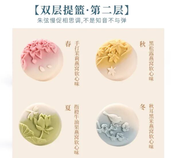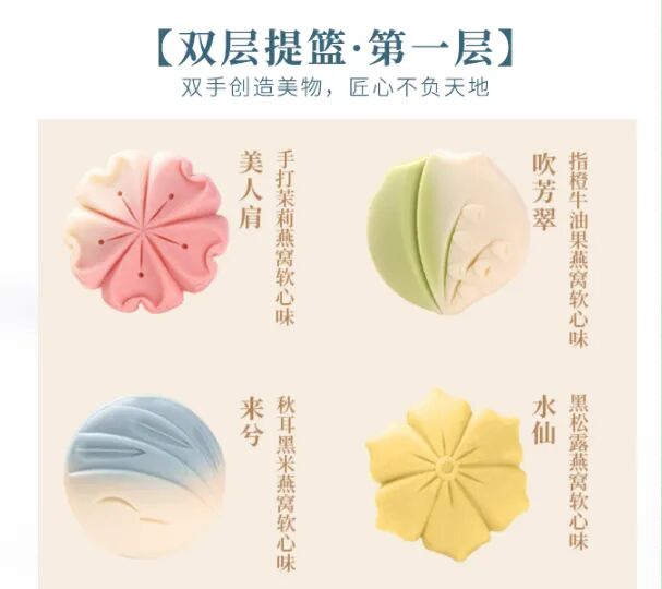 四种口味都以燕窝为软心,搭配以春夏秋冬四季时令的不同食材。礼盒两层形状、雕花各异,或以物为形,或以物为浮雕,都美不胜收。
