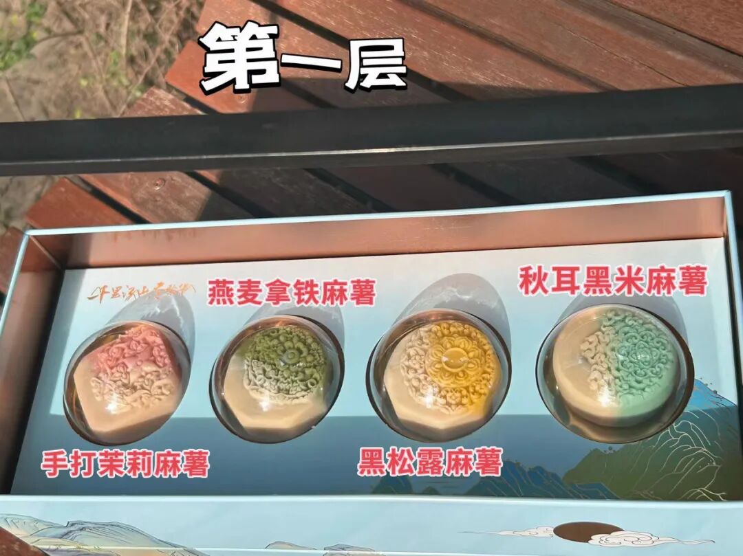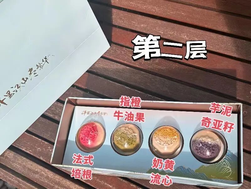打开礼盒,分上下两层,每层4枚,共8枚月饼,8种不同口味。![]()
