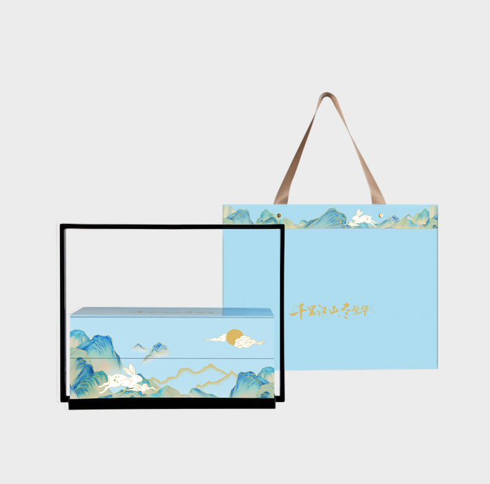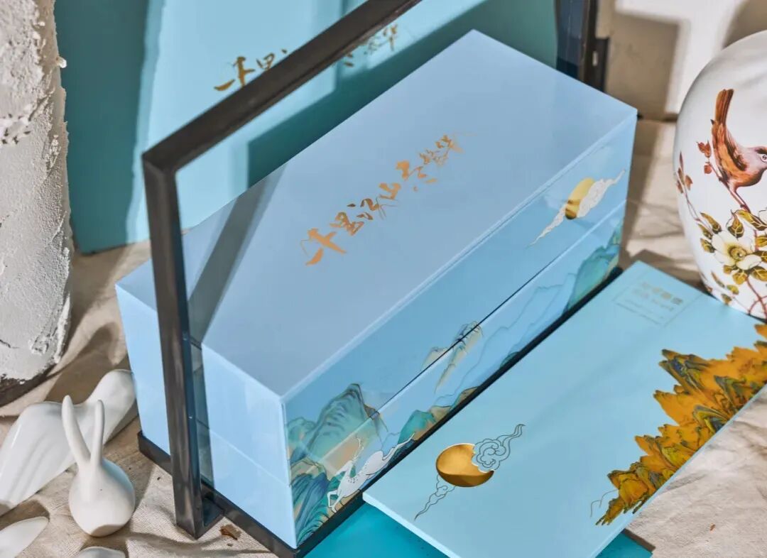 这款中秋礼盒,正是以此画为立意。以淡雅蓝调为底色,盒面草书:千里江山尽繁华,寄托江山繁华、合家欢乐的美好寓意。![]()