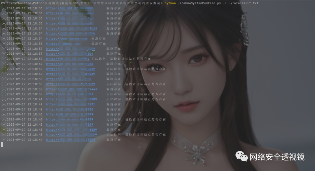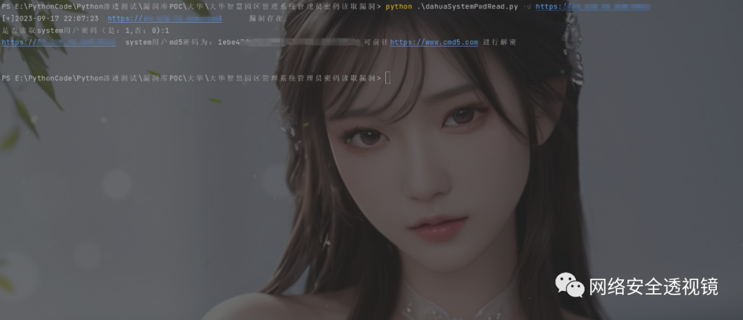 python dahuaSystemPwdRead.py -f filename关注微信公众号 网络安全透视镜 回复 20230917 获取检测脚本