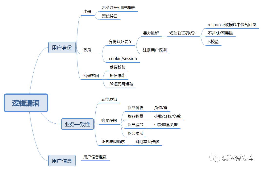 由于程序逻辑不严谨或逻辑太过复杂,导致一些逻辑分支不能正常处理或处理错误,统称为业务逻辑漏洞。常见的逻辑漏洞有交易支付、密码修改、密码找回、越权修改、越权查询、突破限制等,下图是简单的逻辑漏洞总结,在挖掘的过程中更多的时候需要脑洞大开: