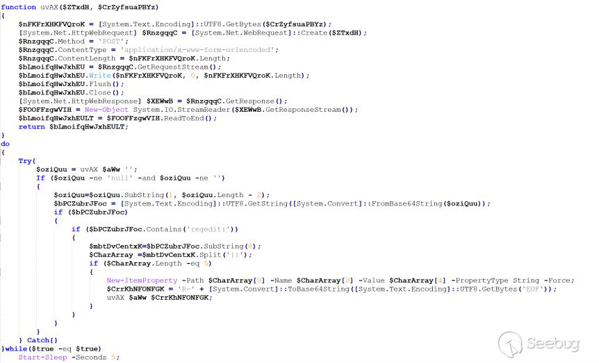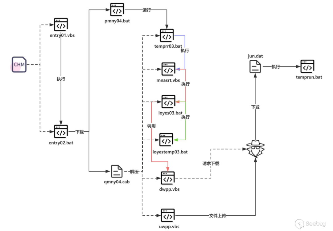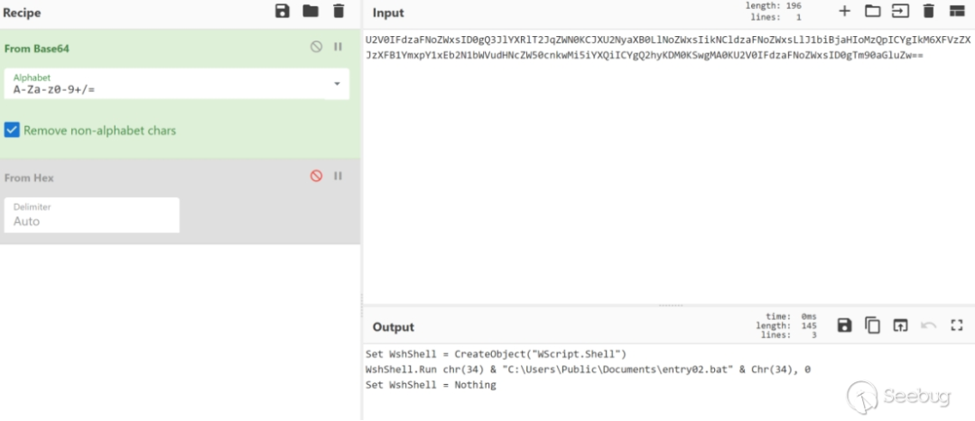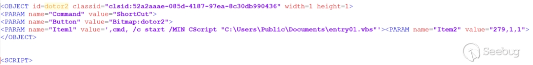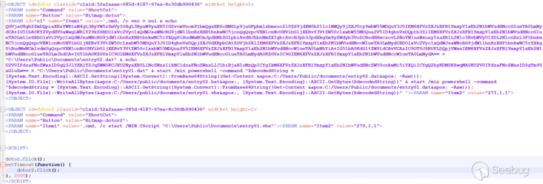 攻击者在chm对应的html文件中内嵌了恶意脚本,利用重定向将编码后的数据写入C:\Users\Public\Documents\目录下的entry02.dat和entry01.dat,后续将entry02.dat中的编码内容解码后写入原文件,将entry01.dat解码后重新写入entry01.vbs:![]()