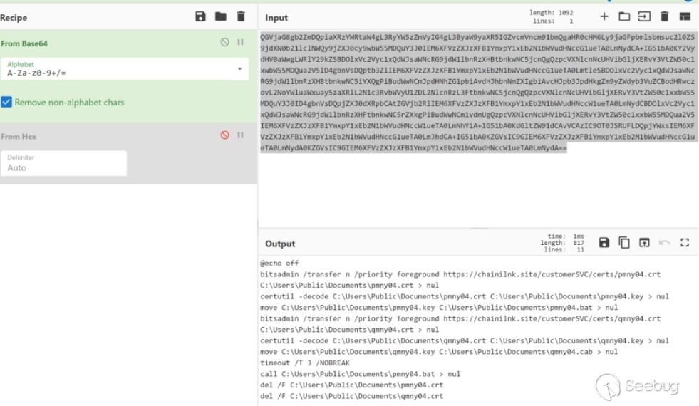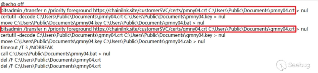 entry01.vbs中运行entry02.dat,entry02.dat利用bitsadmin命令从服务端下载文件,下载地址分别为:- https://chainilnk.site/customerSVC/certs/pmny04.crt