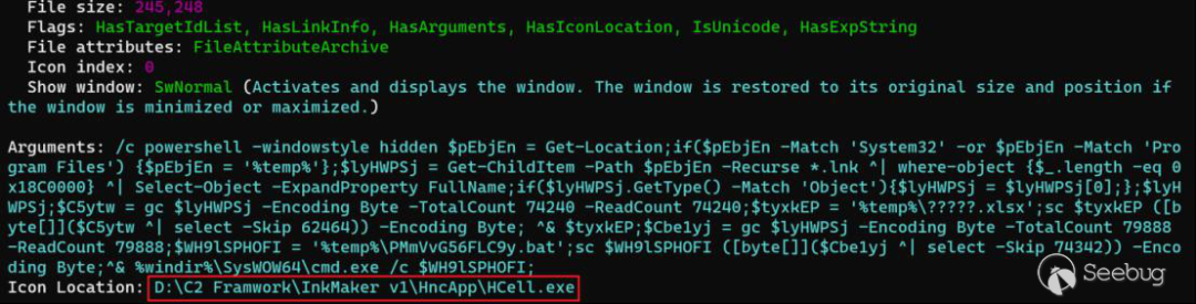 由于APT37组织近期被大量披露,在此我们对已披露内容不做阐述,仅补充部分细节。在我们狩猎过程中,我们发现APT37的超大LNK文件疑似是由一款名为InkMaker v1的打包器打包生成,猜测是由于近期大量的样本制作,操作人员忘记替换打包器相关元数据,导致未去除的元数据直接使用。