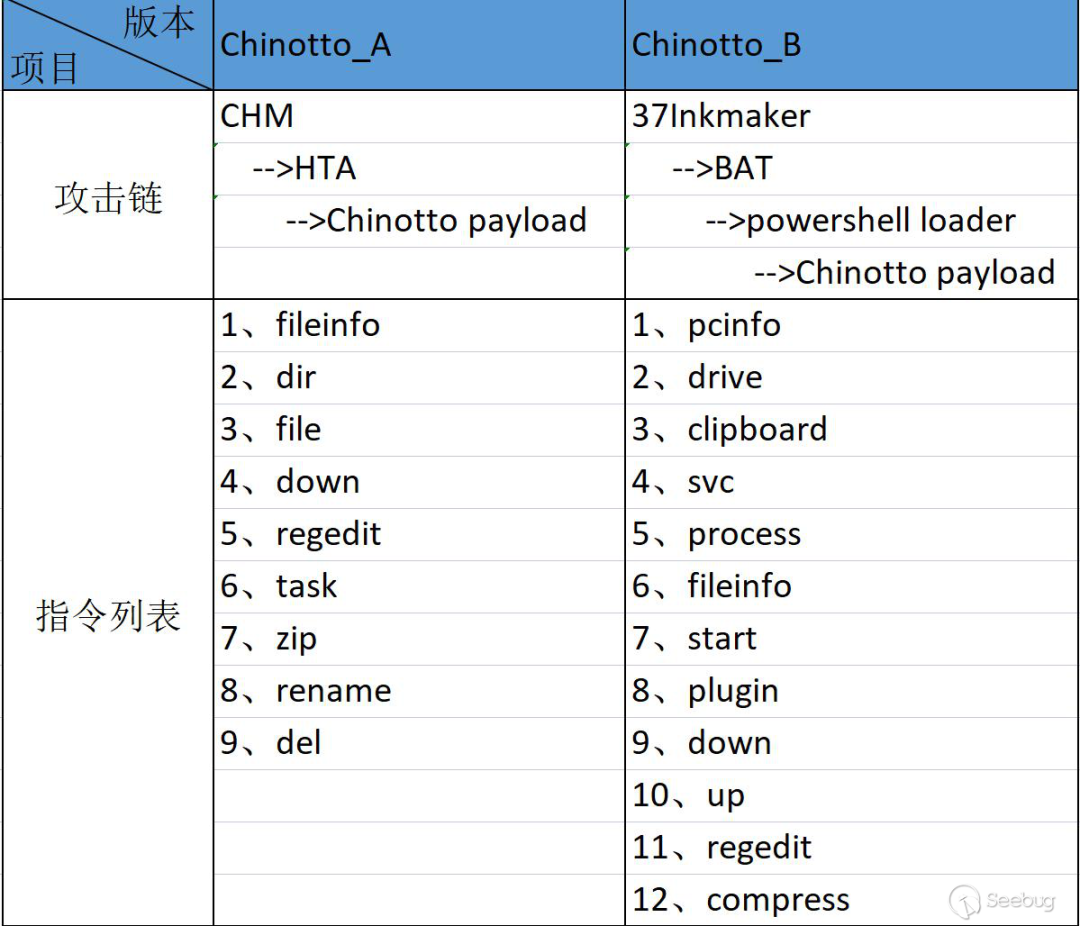 同时我们还发现APT37在近期的攻击活动中存在两个版本Chinotto同时使用的情况,为方便描述,我们将两个版本的Chinotto分别记为Chinotto-A、Chinotto-B。