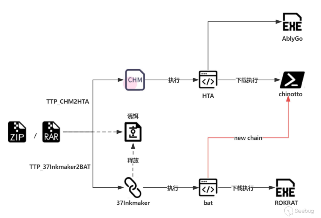 整个8月份的攻击捕获中,APT37的攻击样本捕获数量最多,有将近200个,位居我们狩猎组织之最。8月所捕获的样本中其使用的释放链与之前的差别不大,新攻击链由下图红线标明,相关释放链如下所示:![]()