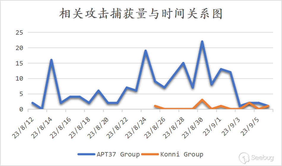 2023年8月,知道创宇404高级威胁情报团队在日常高级威胁狩猎中发现朝方APT组织针对韩方攻击活动有明显的增长,相较于以往的常态化热点攻击来看,本次8月份攻击活动更偏向于大范围批量攻击活动。朝方组织此异常引发我们格外关注,随即我们加强对朝方组织的跟踪强度,根据我们对朝方组织持续一个月的密切跟踪情况来看,本次攻击活动类似于我们先前所披露的俄方APT组织Gamaredon的行动思想,即大范围无差别信息收集工作。我们随即又对近期朝半岛冲突情况进行了解,发现近期韩美开展名为“乙支自由护盾”联合军演,该军演于8月21日零时正式启动,其前身为韩美“乙支自由卫士”联合军演。本次联合军演分两个阶段进行,第一阶段从21日到25日,为期5天;第二阶段从28日到31日,为期4天。我们将朝方APT组织攻击捕获时间与军演时间联合比较,发现两者极为重合,朝方攻击捕获相关时间映射图如下,不排除此次攻击为朝方应对方式之一。![]()