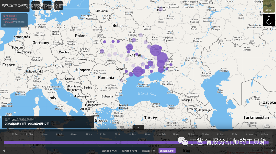bellingcat利用开源情报工具和方法汇聚了1052其网上公开的平民受到伤害的事件。可选择时间段展示相关内容。并可查看每起事件的信息源。