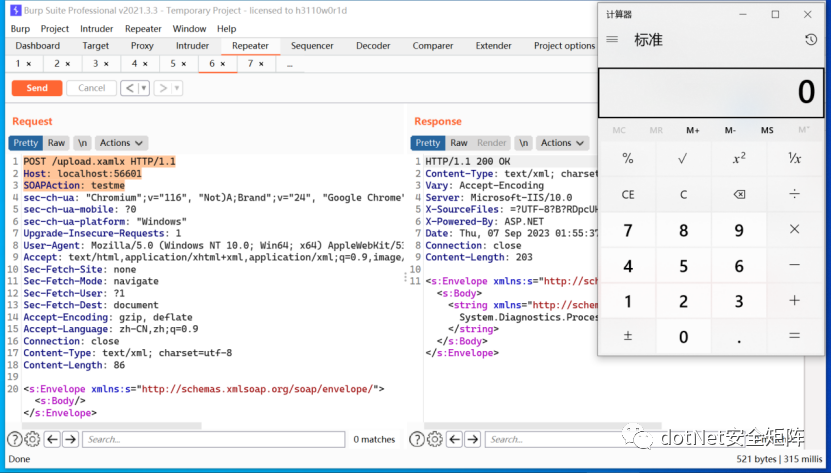 创建 XAMLX 文件来启动本地计算器,该文件使用XAML格式,内部使用<SendMessageContent>标签允许执行.NET代码。