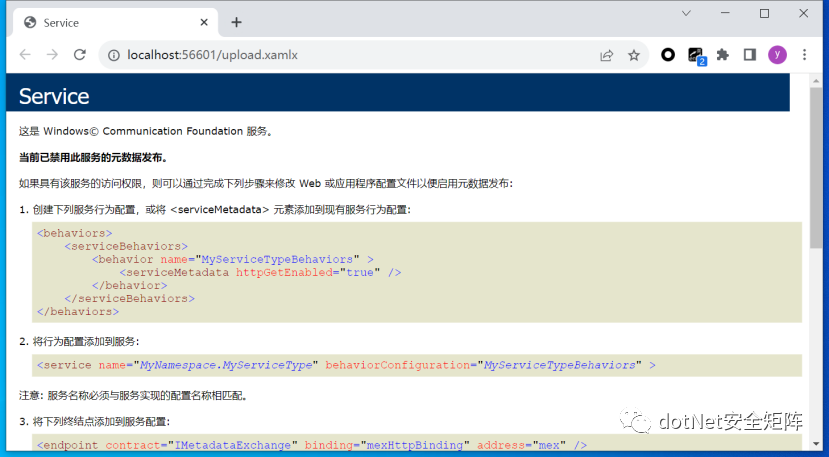 <add name="xamlx-Classic" path="*.xamlx" verb="*" modules="IsapiModule" scriptProcessor="%windir%\Microsoft.NET\Framework64\v4.0.30319\aspnet_isapi.dll" requireAccess="Script" preCondition="classicMode,runtimeVersionv4.0,bitness64" />在IIS里打开 http://localhost:56601/upload.xamlx 显示如下图所示,表示运行环境配置成功