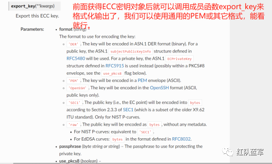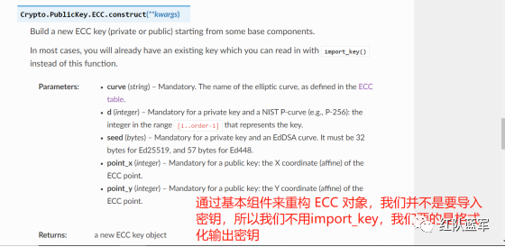 但是输出的是 ECC 密钥并不是可读的,因为它们只是一串字节码,我们需要把它格式化为 ECC 密钥该有的形式,可以从 pycryptodome 官方文档中找到可用的 API ECC — PyCryptodome 3.15.0 文档(https://pycryptodome.readthedocs.io/en/latest/src/public_key/ecc.html#ecc-table)