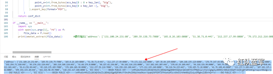 print(emotet_extract(file_data)) #最终输出{'address': ['131.100.24.231:80', '209.59.138.75:7080', '103.8.26.103:8080', '51.38.71.0:443', '212.237.17.99:8080', '79.172.212.216:8080', '207.38.84.195:8080', '104.168.155.129:8080', '178.79.147.66:8080', '46.55.222.11:443', '103.8.26.102:8080', '192.254.71.210:443', '45.176.232.124:443', '203.114.109.124:443', '51.68.175.8:8080', '58.227.42.236:80', '45.142.114.231:8080', '217.182.143.207:443', '178.63.25.185:443', '45.118.115.99:8080', '103.75.201.2:443', '104.251.214.46:8080', '158.69.222.101:443', '81.0.236.90:443', '45.118.135.203:7080', '176.104.106.96:8080', '212.237.56.116:7080', '216.158.226.206:443', '173.212.193.249:8080', '50.116.54.215:443', '138.185.72.26:8080', '41.76.108.46:8080', '212.237.5.209:443', '107.182.225.142:8080', '195.154.133.20:443', '162.214.50.39:7080', '110.232.117.186:8080'], 'ECC ECK1': '-----BEGIN PUBLIC KEY-----\nMFkwEwYHKoZIzj0CAQYIKoZIzj0DAQcDQgAE86M1tQ4uK/Q1Vs0KTCk+fPEQ3cuw\nTyCz+gIgzky2DB5Elr60DubJW5q9Tr2dj8/gEFs0TIIEJgLTuqzx+58sdg==\n-----END PUBLIC KEY-----', 'ECC ECS1': '-----BEGIN PUBLIC KEY-----\nMFkwEwYHKoZIzj0CAQYIKoZIzj0DAQcDQgAEQF90tsTY3Aw9HwZ6N9y5+be9Xoov\npqHyD6F5DRTl9THosAoePIs/e5AdJiYxhmV8Gq3Zw1ysSPBghxjZdDxY+Q==\n-----END PUBLIC KEY-----'}