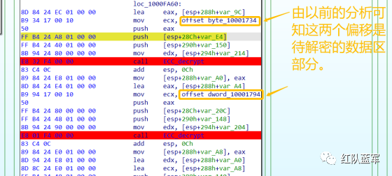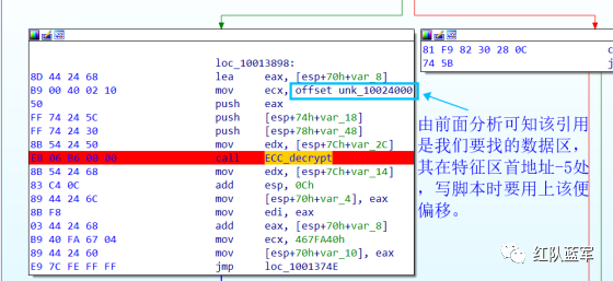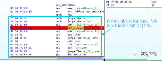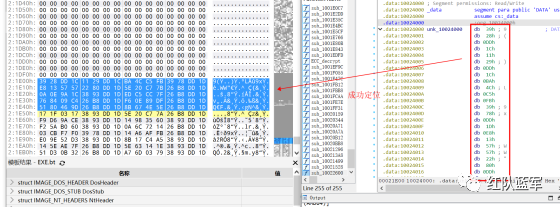 首先在 IDA 或 XDBG 中定位到解密的代码的特征数据区,由于之前分析得很详细了,所以我们直接放上截图:(蓝框就是我们认定的特征区)