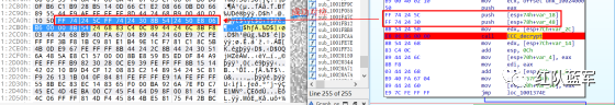 比如说上面蓝框的第一行 FF B4 24 A8 01 00 00 push [esp+28Ch+var_E4] ,由于 IDA 中在识别函数的过程中插入了 var_E4 变量,所以我们对确切的地址部分有点模糊,我们看 xdbg 中的同样位置。