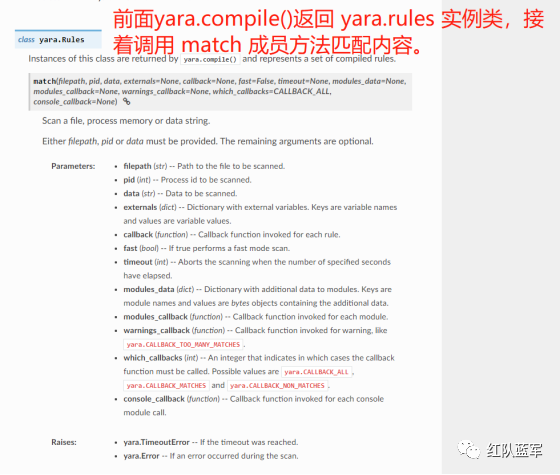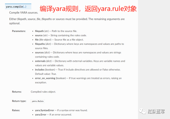 首先参考官方文档了解 Yara API 和 类对象:在 Python 中使用 YARA — yara 4.2.0 文档(https://yara.readthedocs.io/en/v4.2.3/yarapython.html)