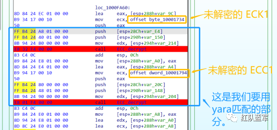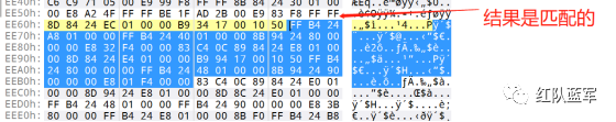 同理,参考前面的密钥区的 Yara 规则,地址部分的都模糊查询,指令码部分的字节都一一对应。所以蓝框区的 Yara 规则就是 {FF 74 [2] FF 74 [2] 8B 54 [2] E8 [4] 8B 54 [2] 83 C4 0C 89 44 [2] 8B F8 03 44 [2] B9 [4] 89 44 [2] E9}