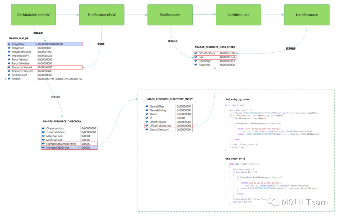在使用GetModuleHandle指明包含资源的模块后,使用FindResource在PE文件格式中查找资源信息,成功后通过SizeofResource和LoadResource获取资源的大小,加载资源。