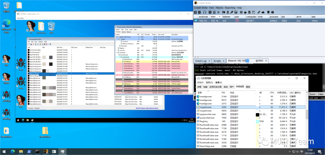 HidenVNC又称HVNC,是一种远程桌面控制技术,多用于银行木马, 可以在受害者不知情的情况下,隐蔽的访问系统,浏览文件、查看凭证、启动程序、登录网银等。为了达到这一目的,HVNC会使用了一些鲜为人知Windows功能,实用CreateDesktop来创建一个新的虚拟桌面,隔绝了与用户操作互相影响。关于HVNC的介绍,看雪的这篇讲的比较全面https://bbs.kanxue.com/thread-264956.htm。总之,HVNC是一种高级的远程控制技术,提供了一种隐蔽的图形化控制手段。