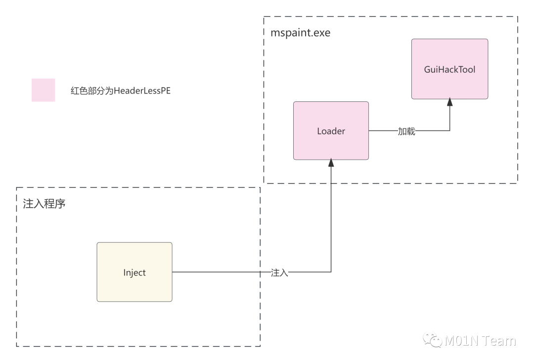 写入mspaint.exe内存,修改权限,修改RIP指向loader的入口函数,恢复mspaint.exe主线程,完成远程注入HeaderLessPE。
