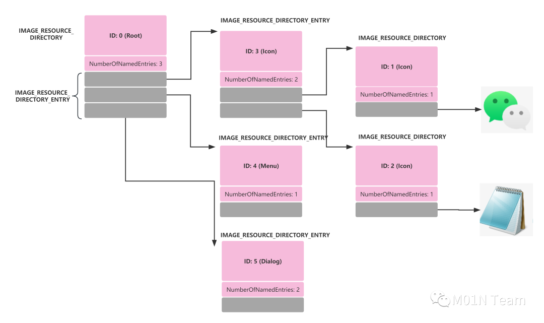 在PE文件格式中,资源可以通过可选头数据目录表的第3个成员IMAGE_DIRECTORY_ENTRY_RESOURCE访问,IMAGE_DIRECTORY_ENTRY_RESOURCE指向了PE资源的根目录,之后资源按照资源类型->资源标识符->资源页的多层目录结构来组织的,只有通过层层索引才能够进入相应的子目录找到正确的资源。其中 IMAGE_RESOURCE_DIRECTORY 中会指明后面数组的成员个数,IMAGE_RESOURCE_DIRECTORY_ENTRY 指向具体的下一层目录结构。