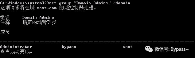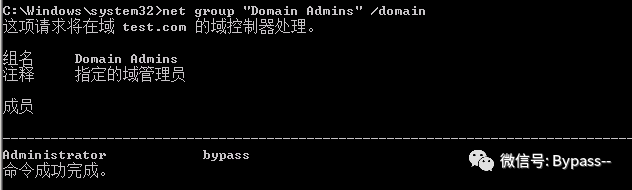 // 添加test用户net user test admin@123 /add /domain// 把 test 用户添加进域管理员组net group "domain admins" test /add /domain