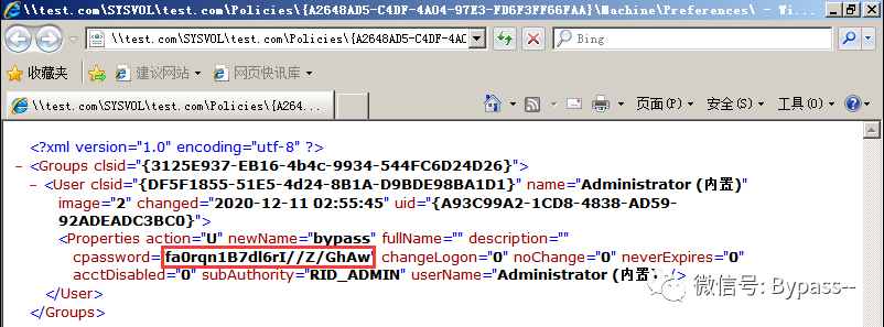 (1)访问SYSVOL共享文件夹,搜索包含“cpassword”的XML文件,获取AES加密的密码。