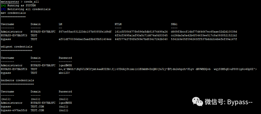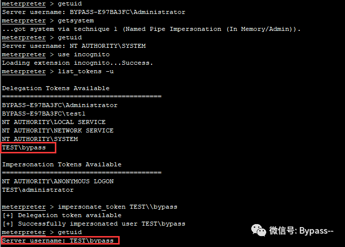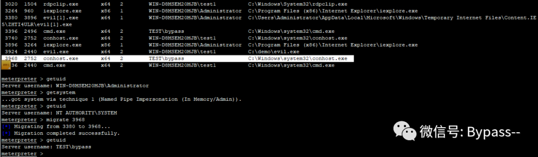 2、利用ps找到域管理员(TEST\bypass)所运行的进程,然后将shell进程迁移到域管理员所运行的进程中,成功后就获得了域管理员权限。如下图所示: