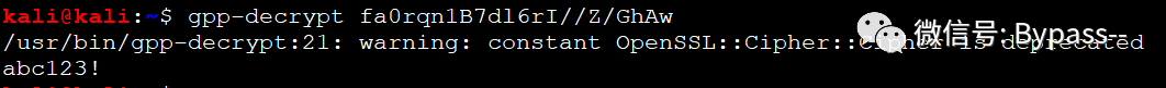 (2)使用kali自带的gpp-decrypt进行破解,从而获取域账号密码,直接登录域管理员账号获取访问权限。