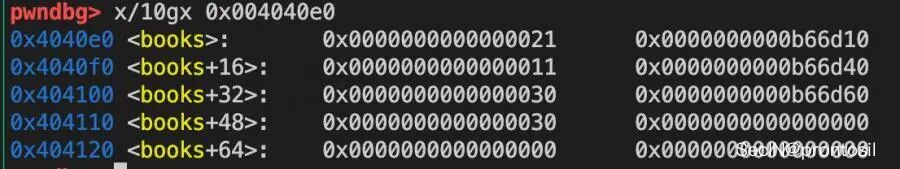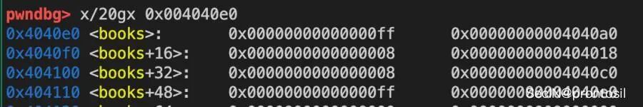pwndbg> x/40gx 0x4040e00x4040e0 <books>: 0x00000000000000ff 0x00000000004040a00x4040f0 <books+16>: 0x0000000000000008 0x00000000004040180x404100 <books+32>: 0x0000000000000008 0x00000000004040c00x404110 <books+48>: 0x00000000000000ff 0x00000000004040e00x404120 <books+64>: 0x0000000000000000 0x00000000000000000x404130 <books+80>: 0x0000000000000000 0x00000000000000000x404140 <books+96>: 0x0000000000000000 0x00000000000000000x404150 <books+112>: 0x0000000000000000 0x00000000000000000x404160 <books+128>: 0x0000000000000000 0x00000000000000000x404170 <books+144>: 0x0000000000000000 0x0000000000000000此时我们就可以理解为