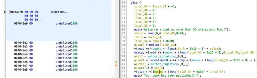 unsigned __int64 write_book(){int idx2; // ebx_QWORD *v1; // rcx__int64 v2; // rdxint idx; // [rsp+4h] [rbp-4Ch] BYREFsize_t size; // [rsp+8h] [rbp-48h]char buf[32]; // [rsp+10h] [rbp-40h] BYREFchar v7; // [rsp+30h] [rbp-20h]unsigned __int64 v8; // [rsp+38h] [rbp-18h]v8 = __readfsqword(0x28u);puts("\nAt which index of the shelf would you like to insert your book?");printf("Index: ");__isoc99_scanf("%d", &idx);getchar();if ( idx <= 0 || idx > 10 || slot[2 * idx - 2] ){puts("Invaid slot!");}else{--idx; // 书架的编号memset(buf, 0, sizeof(buf));v7 = 0;puts("Write me a book no more than 32 characters long!");size = read(0, buf, 0x20uLL) + 0x10; // 读入0x20个字节的内容,还要加上尾部填充的0x10字节idx2 = idx;slot[2 * idx2] = malloc(size);memcpy(slot[2 * idx], buf, size - 0x10);v1 = (char *)slot[2 * idx] + size - 0x10; // 指向用户数据的尾部v2 = qword_4040D8;*v1 = *(_QWORD *)author_signature; // 写入作者签名和一个magic numberv1[1] = v2;books[idx].size = size; // 这里存在问题,后续通过 books[idx].size 获取大小的时候要减掉0x10puts("Your book has been published!\n");}return v8 - __readfsqword(0x28u);}