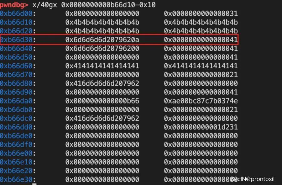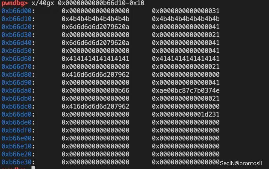 pwndbg> heapinfo(0x20) fastbin[0]: 0x0(0x30) fastbin[1]: 0x0(0x40) fastbin[2]: 0x0(0x50) fastbin[3]: 0x0(0x60) fastbin[4]: 0x0(0x70) fastbin[5]: 0x0(0x80) fastbin[6]: 0x0(0x90) fastbin[7]: 0x0(0xa0) fastbin[8]: 0x0(0xb0) fastbin[9]: 0x0top: 0x5555555593b0 (size : 0x20c50)last_remainder: 0x0 (size : 0x0)unsortbin: 0x0(0x90) tcache_entry[7](2): 0x555555559330 --> 0x7fffffffe508 --> 0x555555555410 (overlap chunk with 0x555555559320(freed) )