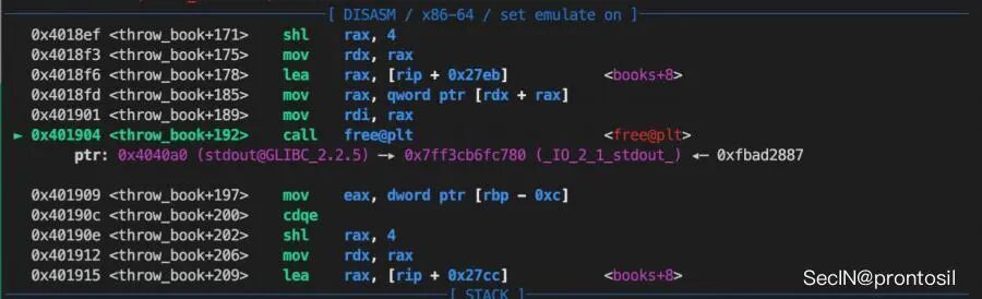 unsigned __int64 throw_book(){int v1; // [rsp+4h] [rbp-Ch] BYREFunsigned __int64 v2; // [rsp+8h] [rbp-8h]v2 = __readfsqword(0x28u);puts("\nAt which index of the shelf would you like to throw your book?");printf("Index: ");__isoc99_scanf("%d", &v1);getchar();if ( v1 > 0 && v1 <= 10 && slot[2 * v1 - 2] ){free(slot[2 * --v1]);slot[2 * v1] = 0LL;puts("Your book has been thrown!\n");}else{puts("Invaid slot!");}return v2 - __readfsqword(0x28u);