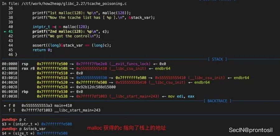 size_t stack_var; // 目标投毒的地址intptr_t *a = malloc(128); // addr: 0x5555555592a0intptr_t *b = malloc(128); // addr: 0x555555559330free(a);free(b);b[0] = (intptr_t)&stack_var; // tcache poisoning !intptr_t *c = malloc(128);assert((long)&stack_var == (long)c); // 此时我们已经获得了针对栈地址 &stack_var 读写控制权然后我们来分过程看每一个环节的堆内存布局变化