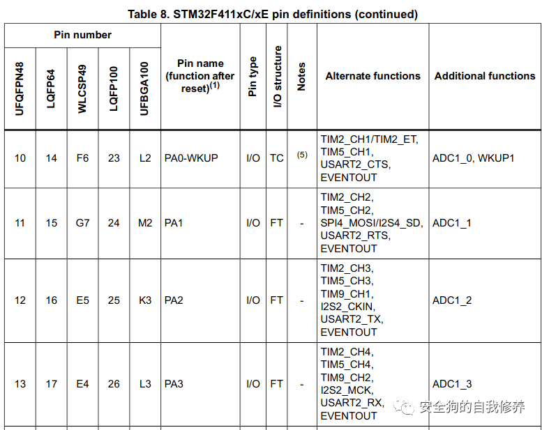 PCB上标记为U7的diva板中使用的微控制器是STM32F411x,我们可以在其数据表中找到有关具有UART接口连接的引脚的信息。下图显示了数据表的该部分。