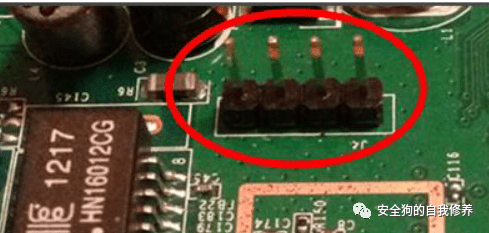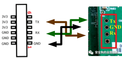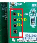 Vcc 通常不用于连接到 UART 接口,但识别它可以缩小搜索范围,找到其他两个引脚 Rx 和 Tx。