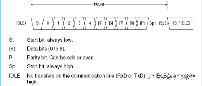 每个要传输的数据字节都有一个逻辑低电平起始位、数据位、可选奇偶校验位、一个或多个停止位。在大多数情况下,首先发送数据位的最低有效 (LSB)。起始位指示接收器的新数据字节的到来,后跟 5 到 9 位数据。在所有数据位之后会出现一个可选的奇偶校验位,后跟一个或多个始终为逻辑高电平的停止位。STOP位指示接收器对发送器发送的数据字节的完成情况。更多细节可以从这里阅读。数据位的传输速率,即每秒比特数,称为波特率。发送和接收UART接口应具有相同的波特率、数据长度、奇偶校验位和停止位,以便正常运行。
