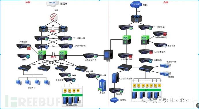 这是一个本人规划的一个安全架构设计图(勿喷)献上这个的原因是我希望大家在看这篇文章有个参考,在架构设计的时候,安全部门就应该参与并融入一些安全观念,比如考虑后期的抗D方案架构设计。网站是否负载均衡分流,是否上CDN,在架构设计方面应该考虑分层思想、边界防御、纵深防御(主机安全比如ossec、应用安全比如waf、边界安全比如snort)等思想!网络方面我们应该考虑设备的冗余,交换机采用HA部署方式。网站结构方面是否采用站库分离、前后端分离。同时全层的架构设计也应该结合等保2.0来设计,这样也方便后期的等保过级。应该特别注意的是前期我们应该做好严格的安全域的划分,不同区域的安保级别划分以及不同区域之间在防火墙上面的访问策略.