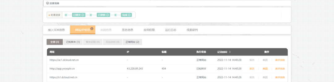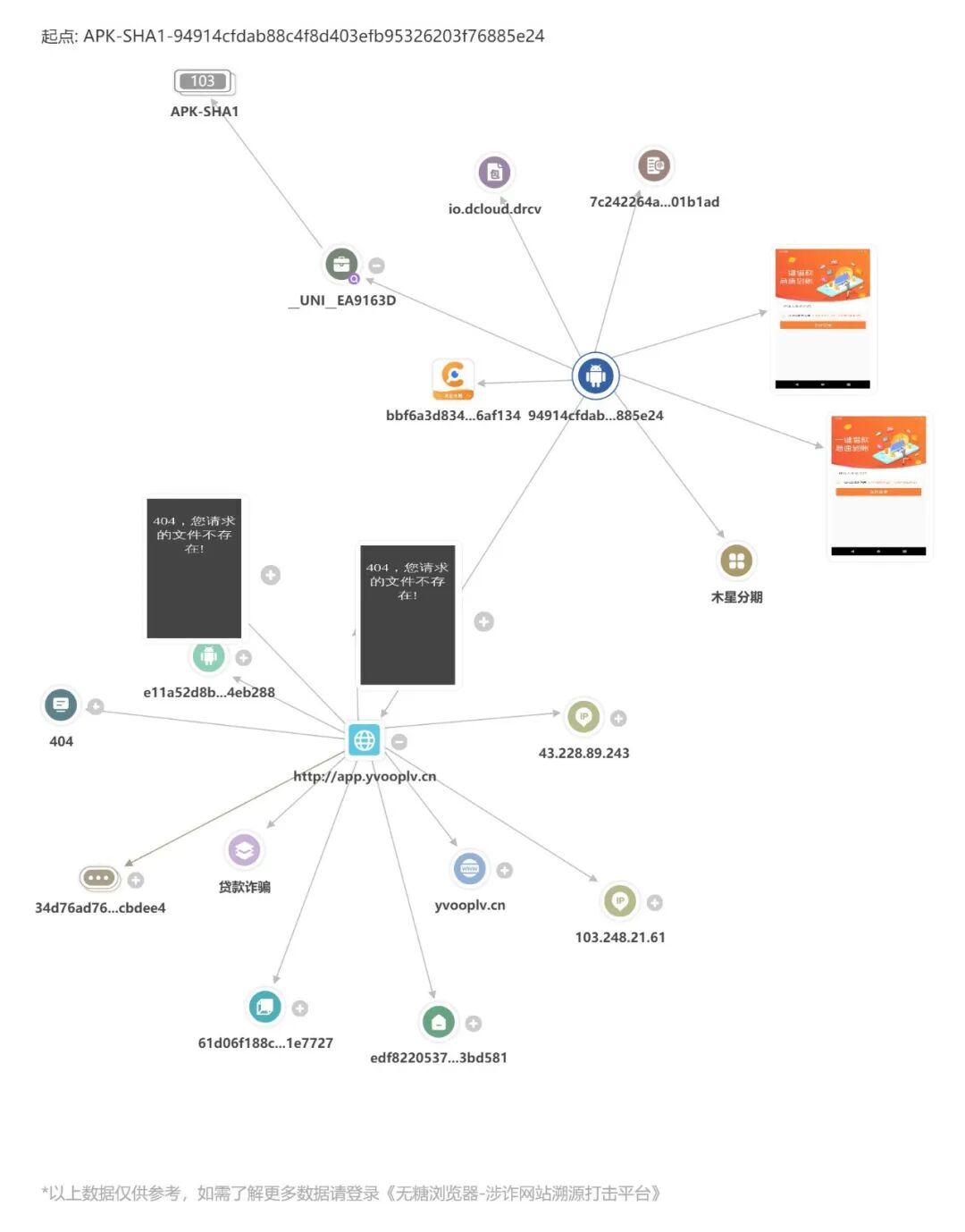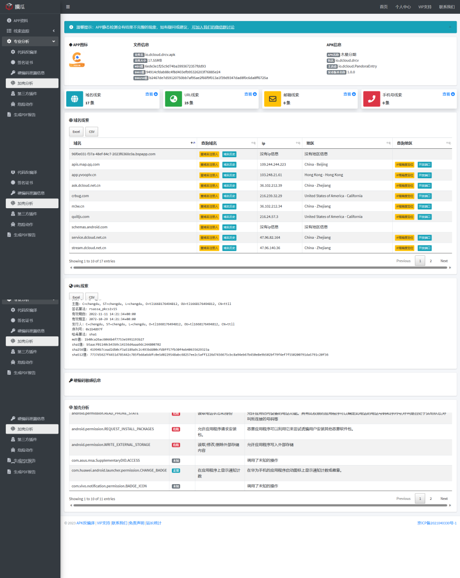 在与一些用户交流的时候,也遇到过用户咨询如果APP关闭了,还可以去静态分析和动态分析嘛?当然是可以的,可以抓包、反编译获取APK的(历史)服务器和签名信息等,用来串并案、扩线。虽然APP关闭了,但是嵌在这个APP里面的域名网址还是有的,我们通过动态模拟其实还是能够获取到,获取到之后我们可以通过一些技术手段来进一步处理,比如他这个服务器还没有关闭,我们可以通过DNS反查,查域名历史解析的IP,看看这个IP是否存在,因为现在很多涉网犯罪,他们的域名因为成本很低,会经常换,但是实际上他的服务器可能没有换,那我们找到他历史的IP之后,找到服务器,再去查服务器关联的新的域名,这也是有可能找到一些线索的。