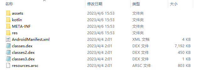 在案件中我们一般分析的是APK文件,APK(Android application package),Android应用程序包,是一个标准的 ZIP 文件,即 1.apk == 1.zip。我们想要分析这个压缩包,首先就得把他解压打开,打开之后一般可以得到下面这些文件。